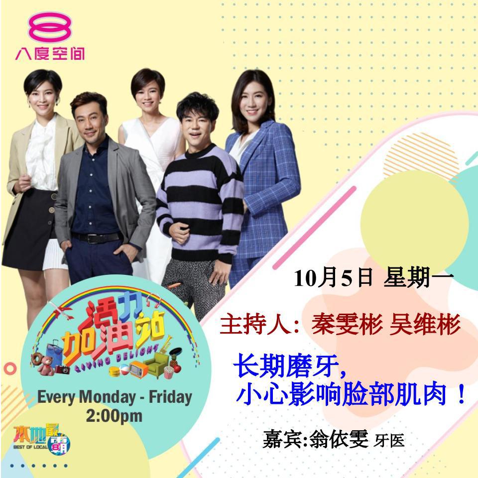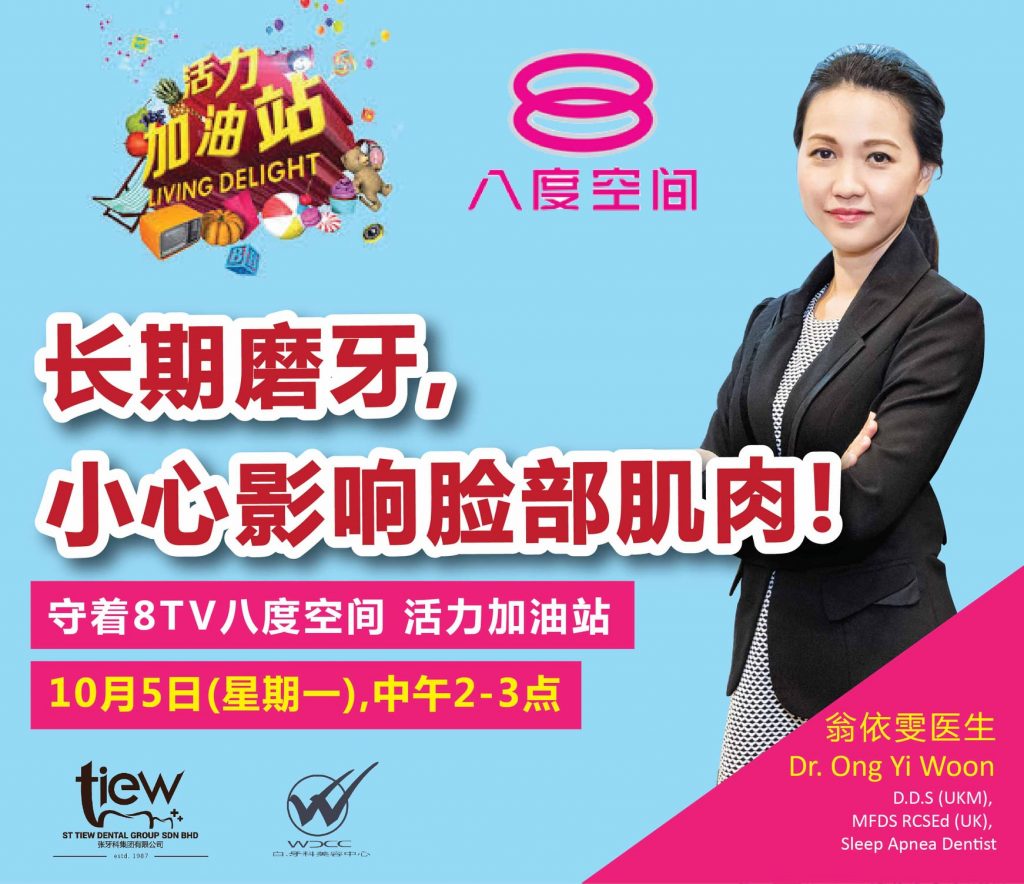Lasting problems can occur as a result of grinding teeth. Many people find that, over time, continued teeth grinding can cause the muscles within the facial structure to bulk up. This can give the person a wider face and can alter their overall appearance significantly. Let’s Dr.Ong Yi Woon Live @ 8TV about teeth grinding! 5th October 2pm @ 8TV