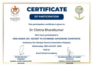 2025 (3rd August) – Certificate of Participation – FRB Hands-On: Secret to Stunning Anteriors Composite hosted by Manipal Alumni Association Malaysia, held at Excel Dental Academy