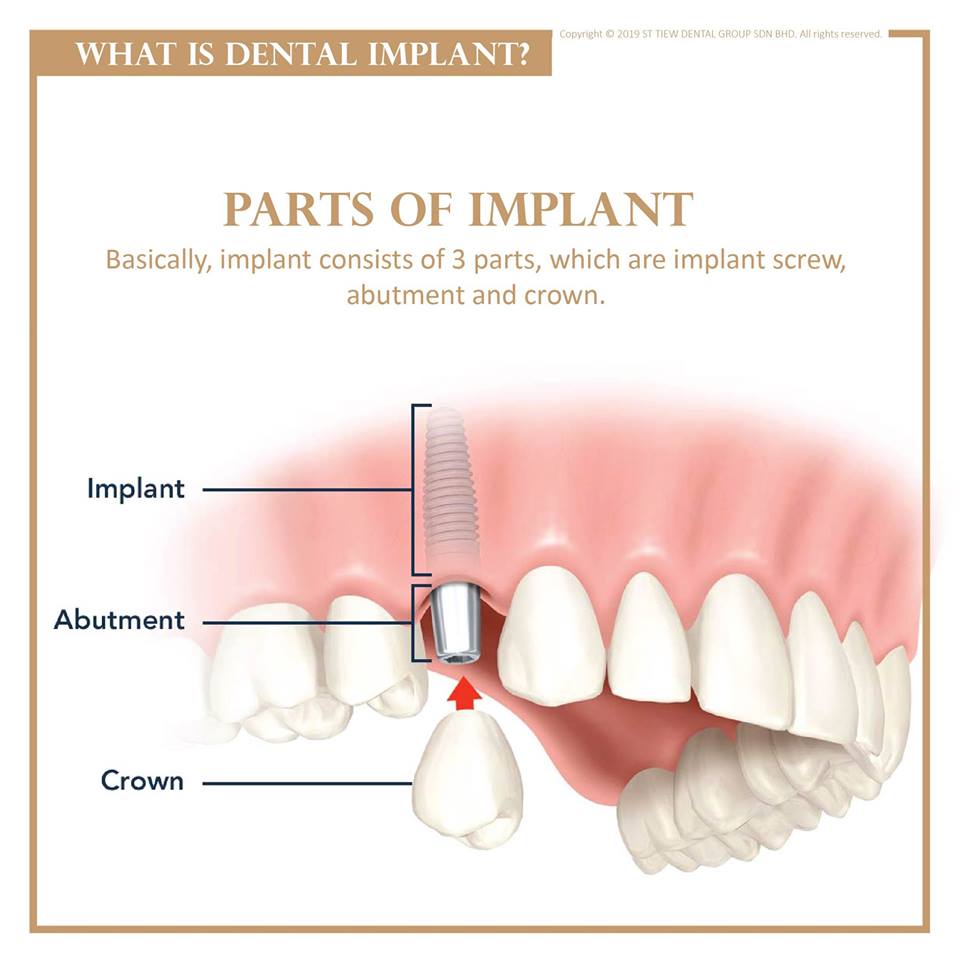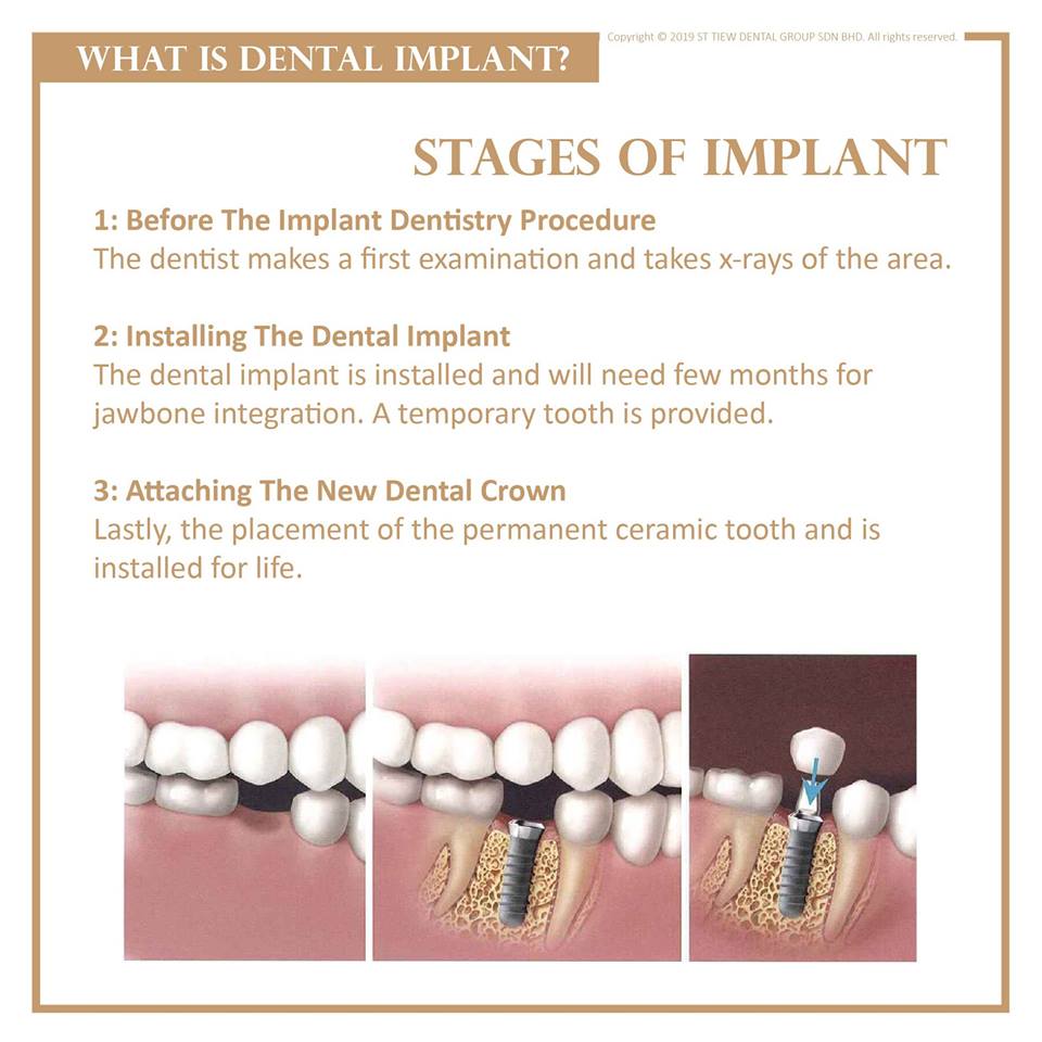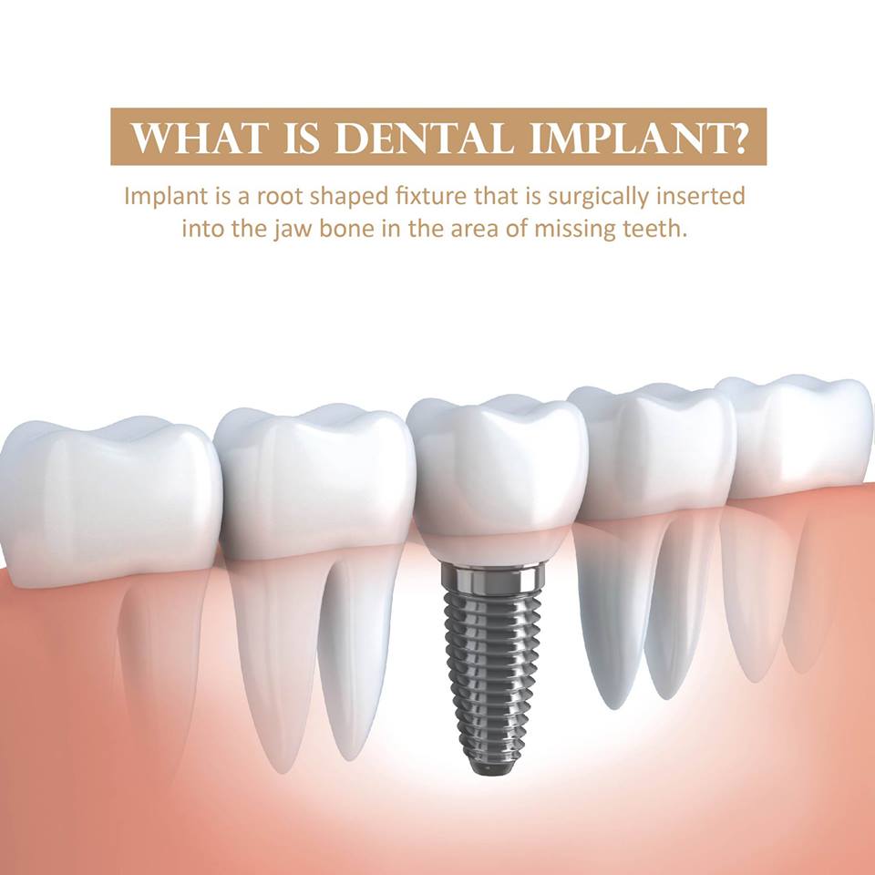Implant is a root shaped fixture that is surgically inserted into the jaw bone in the area of missing teeth.